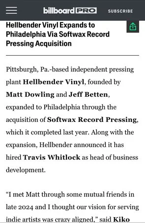 On a personal note, Hellbender Vinyl — the vinyl record pressing plant I founded with my buddy, Jeff Betten — just got a mention in Billboard about our expansion to Philly that we are all really excited about. Check it out if you have a chance, and if you’d like to know more about the two plants or what’s going on with the vinyl industry, give Hellbender a follow on Instagram.